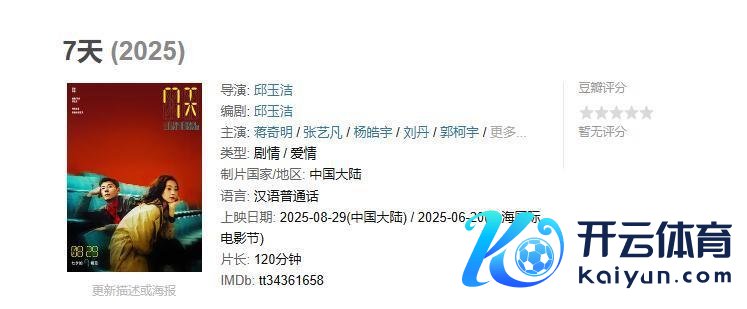 《七天》则是一部充满清新感和奇妙感的爱情片。影片由蒋奇明和张艺凡主演,阐明了一个对于限时爱情的故事。陈丑时(蒋奇明饰)在牙科诊所再见了女孩温倩(张艺凡饰),两东谈主运转了一段奇妙的爱情。
