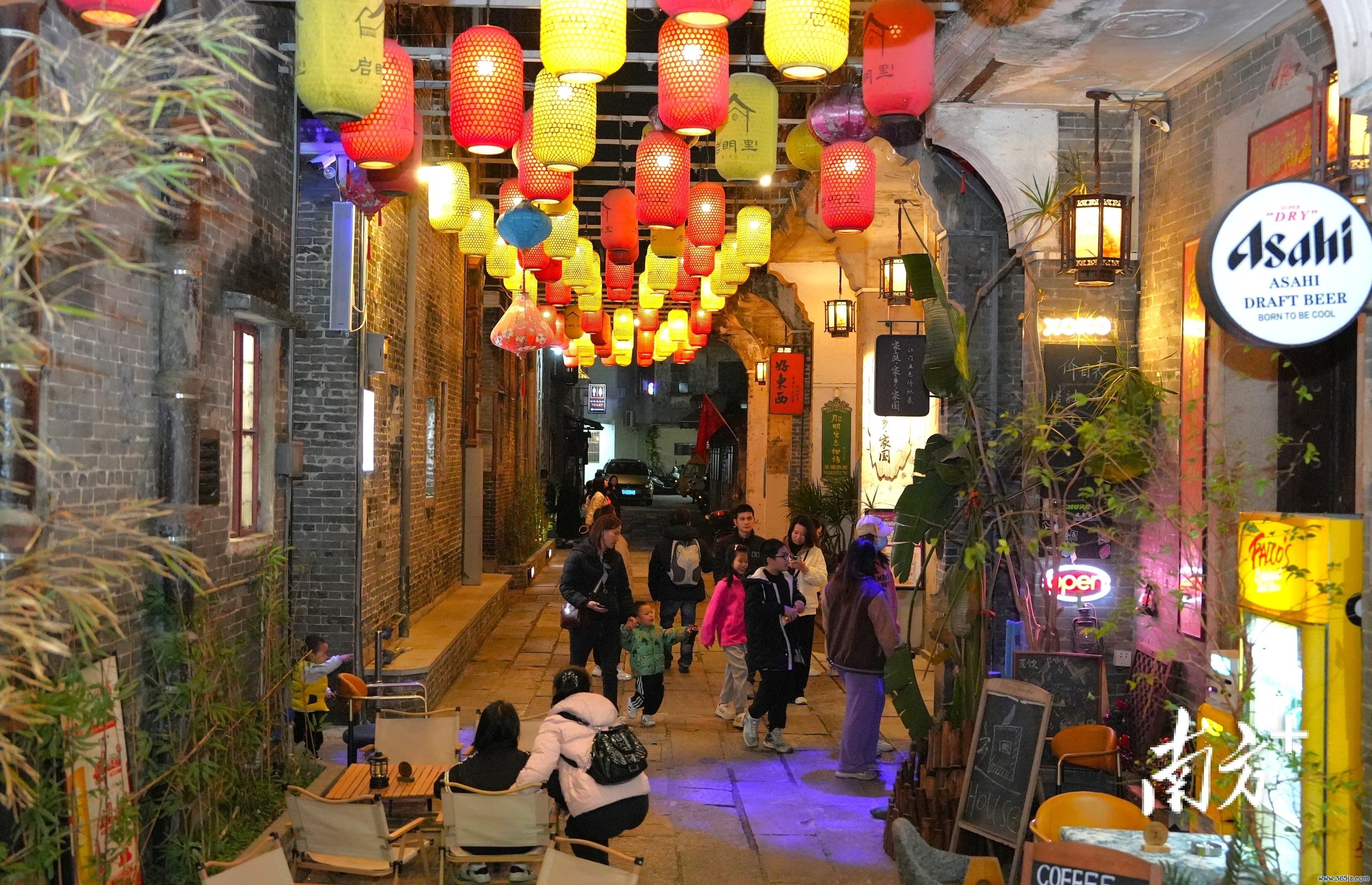 祝屋巷位于惠州西湖畔,因明代“江南四大才子”之一祝枝山曾在此筑屋而得名。这里全体呈“一街十巷”神色,房屋约300栋。频年来,祝屋巷经由修订,成为集文创、好意思食、舒适于一体的文旅街区。如今,这里不仅有祝枝山馆等文化场馆,还有浩荡网红店铺和夜景打卡点。