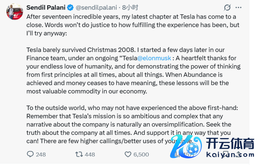 特斯拉财务副总裁Sendil Palani在酬酢媒体发文称,在为该公司效劳17年后将辞职。他自2021年起担任该职务,在特斯拉的两段任职技术,曾先后认真财务、工程及制造等相关职责。