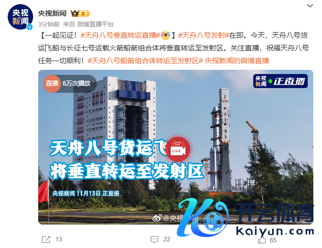 IT之家 11 月 13 日音讯,今天,天舟八号货运飞船与长征七号输送火箭船箭组合体将垂直转运至辐照区,现在央视仍是开启了直播。