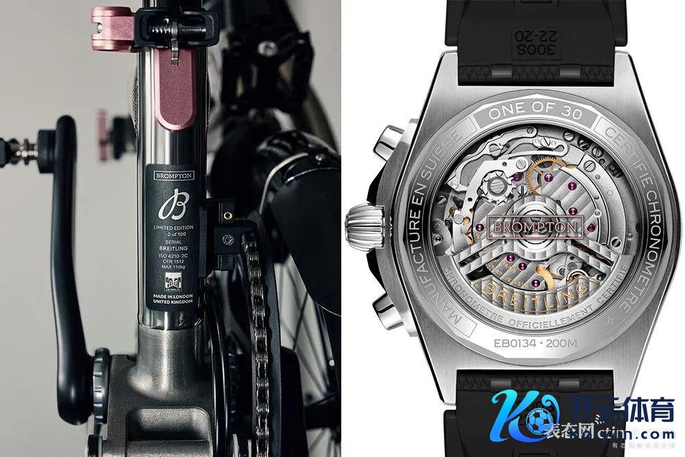翻转腕表,透明表底也带有粉色的BROMPTON 品牌符号,表背外圈刻有“ONE OF 30” (30枚之一)专属字样,象征腕表的限量属性。相应地,限量版折叠自行车除BROMPTON 自身品牌符号和限量100辆数字编番外,在车架上管前端更以激光镭射镌刻有BREITLING 品牌符号。