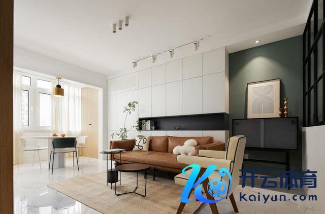 来到客厅,相较于玄关,这里则是以白色基调通顺了所有空间,再搭配上灰绿色的沙发墙,以及橙色的沙发,既让两块空间作念到了呼应,又冲破了千里闷。而给部分沙发墙作念储物柜预备,则在晋腾飞间收纳才智的前提下,也让空调齐备了隐形,使视觉愈加斡旋好意思不雅。