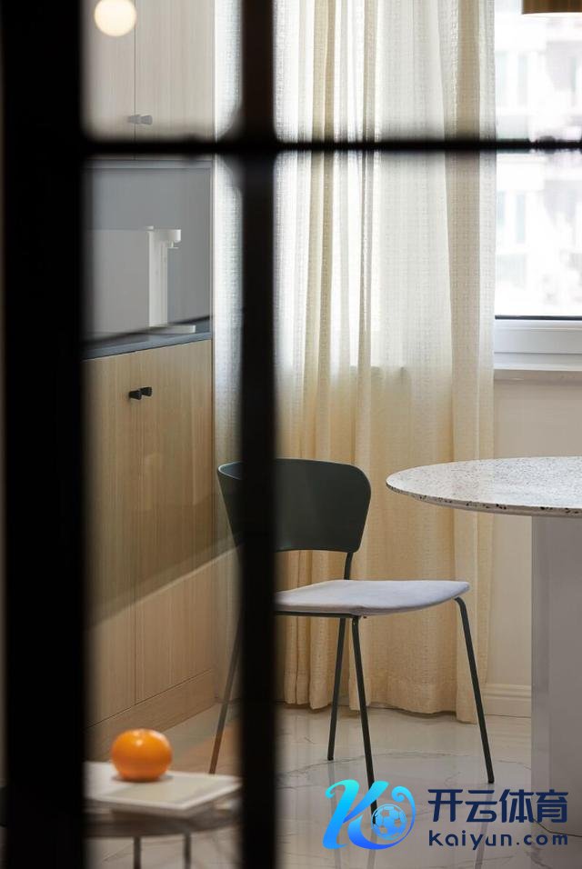 要点说一下餐厅预备,接头到南阳台的开间,不及以摆下一张老例尺寸的餐桌,是以弃取圆桌,并借用部分客厅的面积来摆放,不仅让动线愈加畅达了,也齐备了辽远的空间体验。