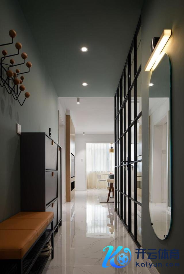 当餐厅改成一个斗室间后,也转折性让入户变成了一块齐全的玄关区。左边建立超薄的鞋柜及换鞋凳,右边安设上全身镜,既措置了基本的收纳需求,也完善了空间的功能性。而给墙顶面刷上灰绿色的乳胶漆,也营造出了静谧、崭新的空间气味。