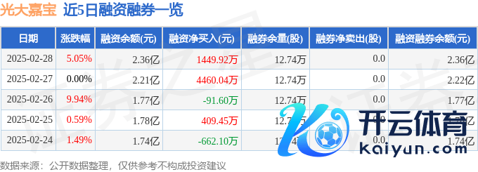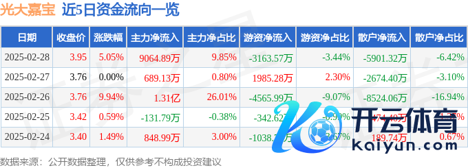 本站音问九游体育app娱乐,范围2025年2月28日收盘,光大嘉宝(600622)报收于3.95元,高潮5.05%,换手率15.59%,成交量233.81万手,成交额9.2亿元。