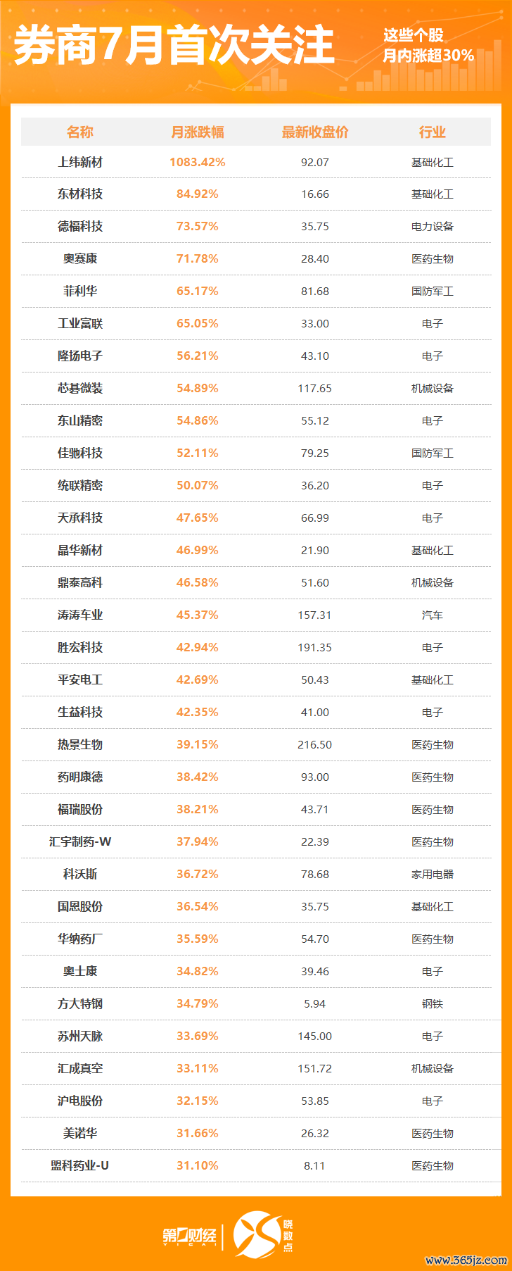 具体来看,涨幅位居第一的是上纬新材,该股7月以来获东吴证券初次关怀,给以“增捏”评级。