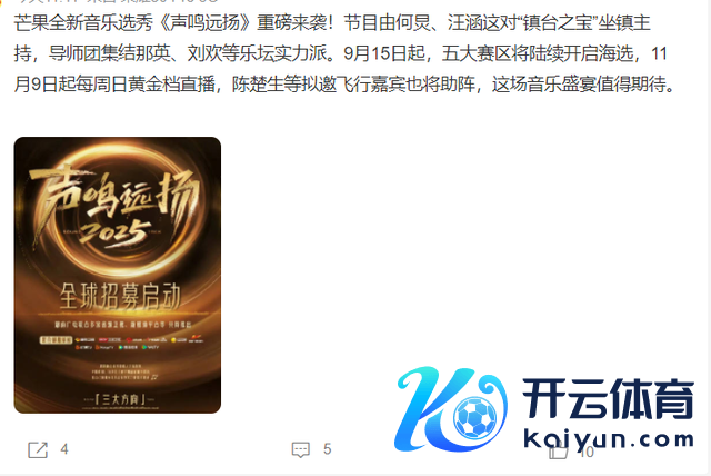从2021年到当今,已进程去四年,芒果终于初始再次组织大型选秀节目,从传出的音信上看,这档选秀综艺名叫《声鸣远扬2025》,这档综艺节目是六家省级卫视,芒果和鹅共同制作的优秀颂扬东说念主才聘用节目,俗称“选秀综艺”。