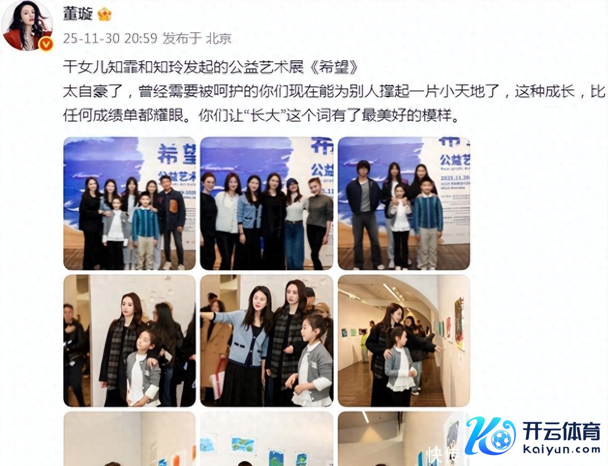 12月1日,演员董璇在个东谈主酬酢平台共享了一组带女儿小酒窝助威闺蜜关悦俩女儿艺术展的像片,她还发文知道此次两个干女儿发起的是公益艺术展,算作干妈的她感到止境粗犷。看得出来,见证干女儿们成长的董璇,真的是喜跃满满。