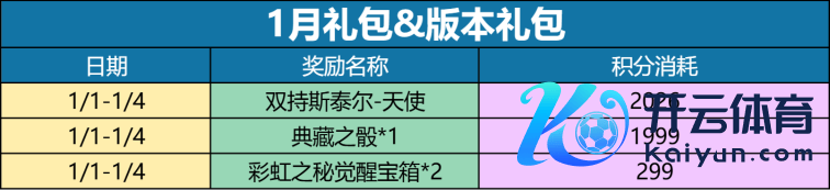 版块礼包福利更多,1月1日-1月4日历间,双握斯泰尔-天神、典藏之骰等 这些珍稀谈具上架。其中双握斯泰尔-天神需要2026积分兑换,逐日总限1000,念念要获得这款兵器的小伙伴们可要属意啦!典藏之骰需要1999积分兑换,每东谈主可以兑换一个;1月份还有版块礼包可以兑换,这可太期待了。错过此次再等一年齐不一定有!