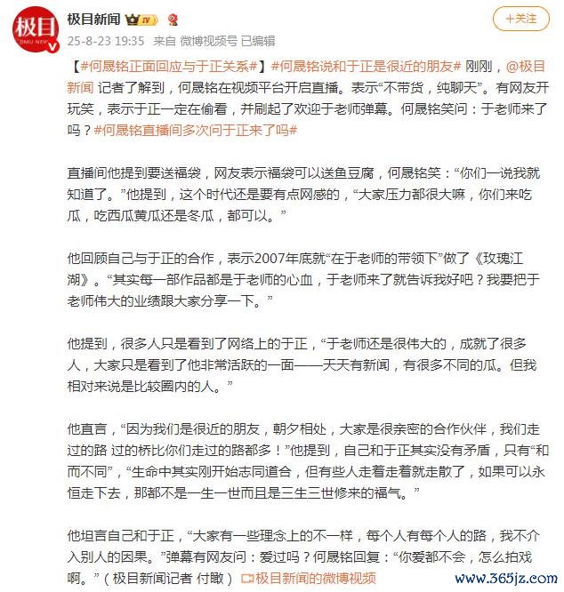 直播回话和于正的干系,他说他们是很近的一又友、夙夜共处、亲密的伙伴,还说我方和于正莫得矛盾,仅仅"和而不同",致使夸于正"很伟大,树立了许多东谈主"。
