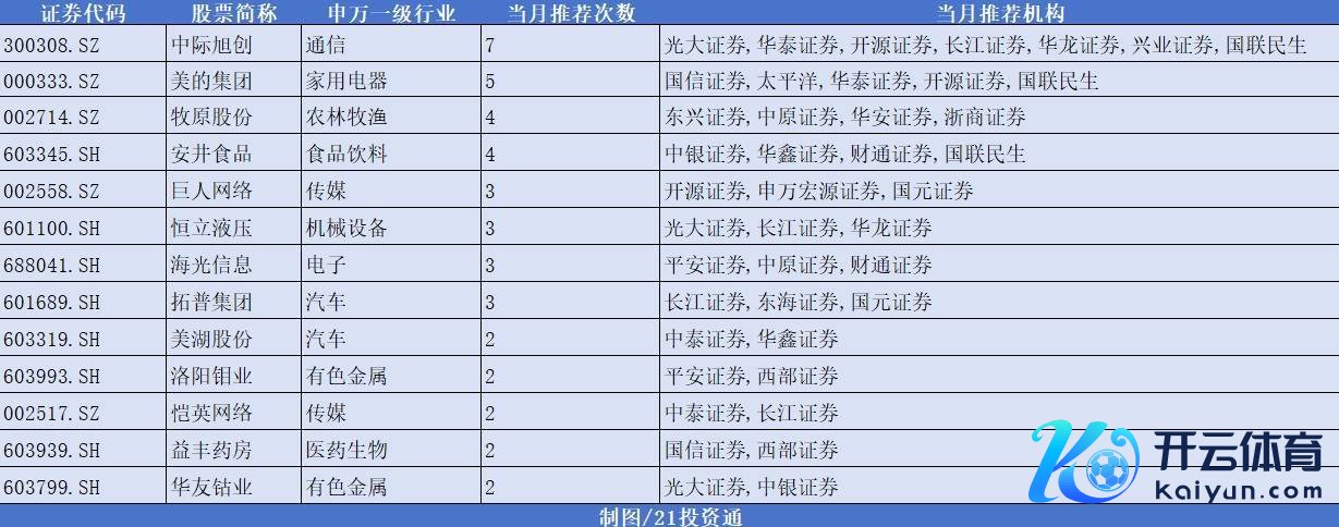在统计的30余家券商12月金股中,中际旭创获7次推选,好意思的集团紧随后来被“点排行数”也达5次,牧原股份、安井食物、巨东谈主网罗、海光信息等股也被屡次说起。