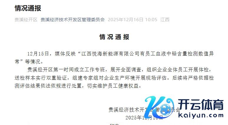情况通报显露,12月15日,媒体响应“江西悦海新动力有限公司有职工血液中铅含量检测数值极度”等情况。