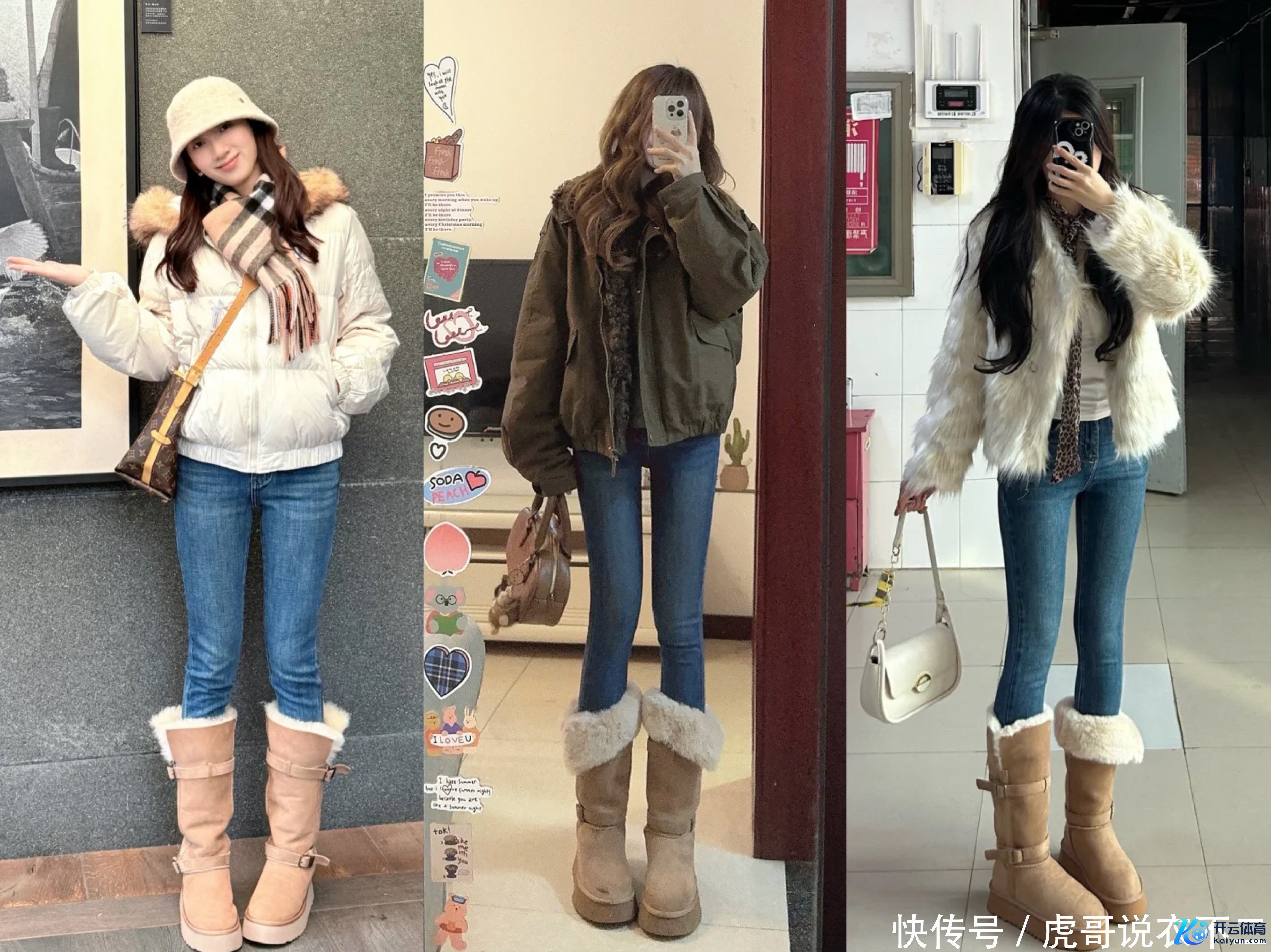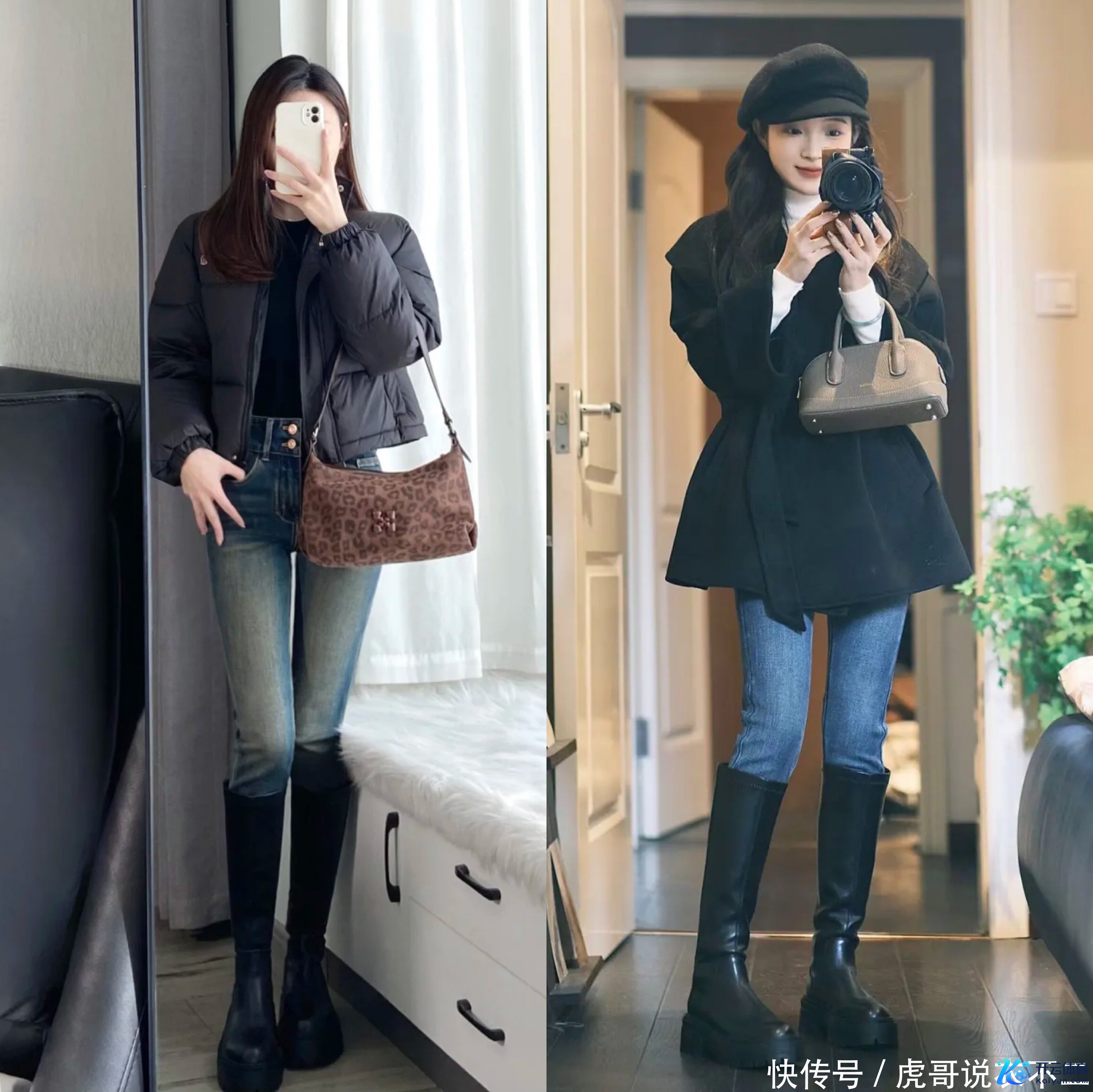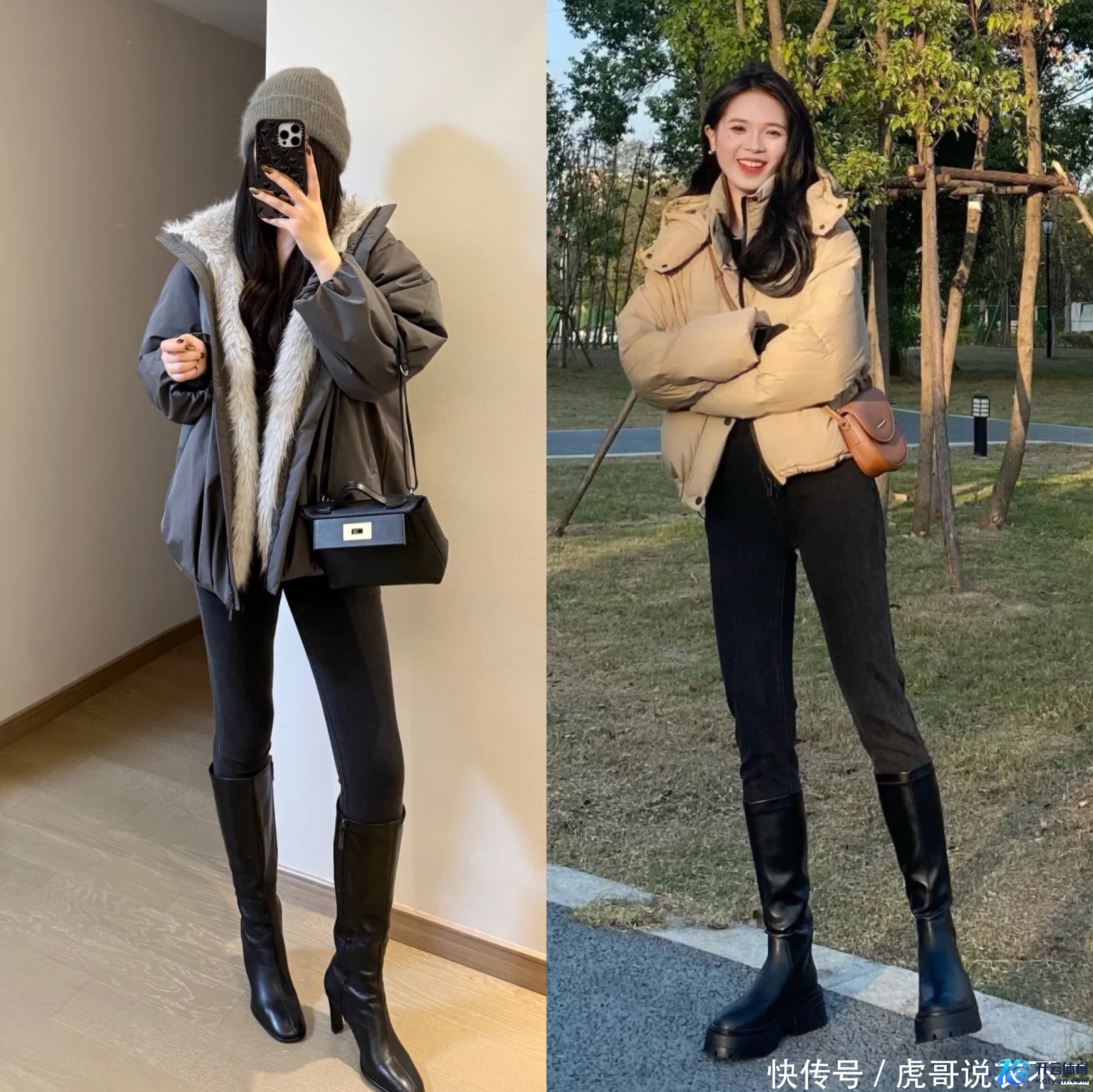 2、羽绒服+金莲裤+长筒靴