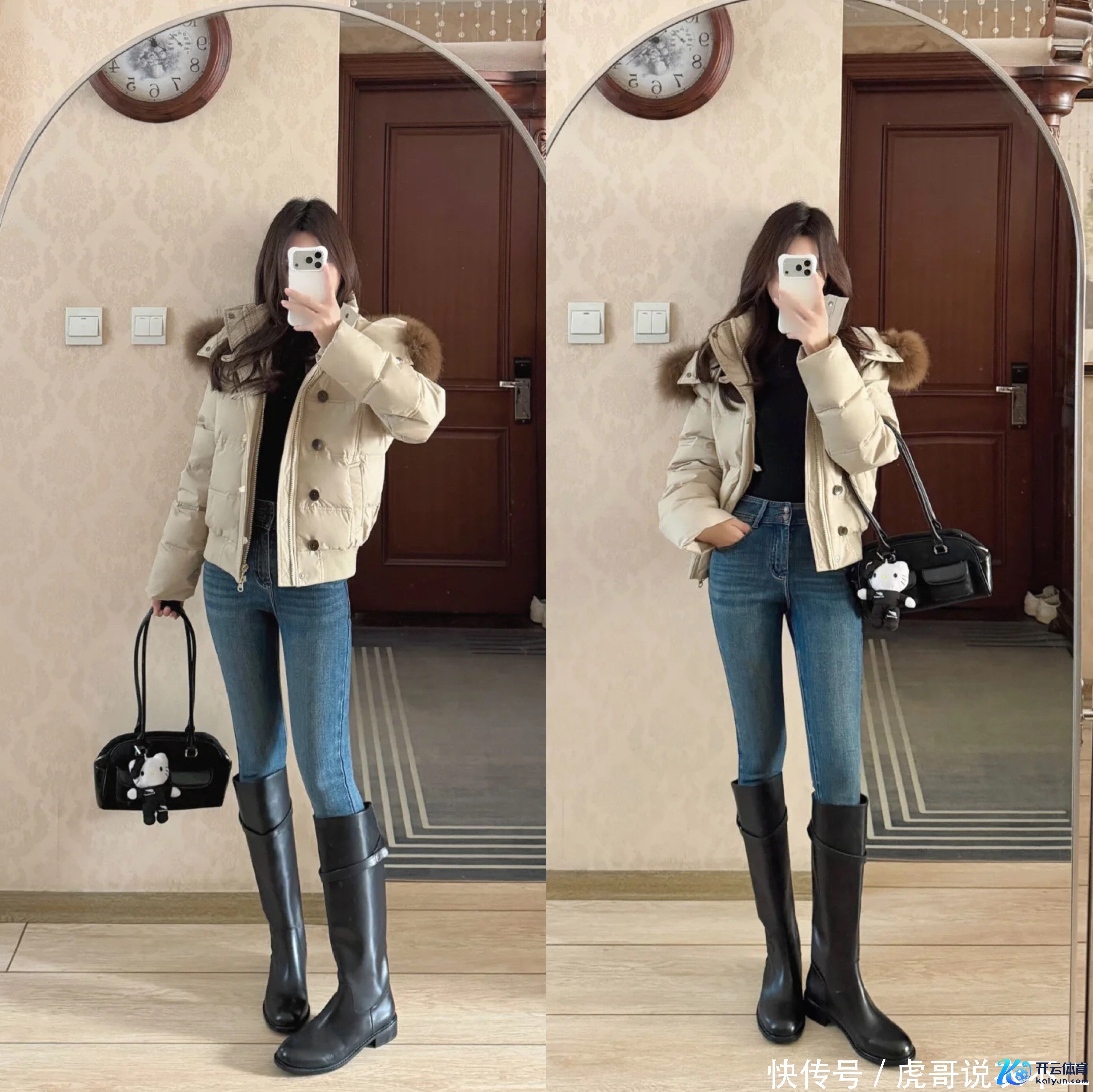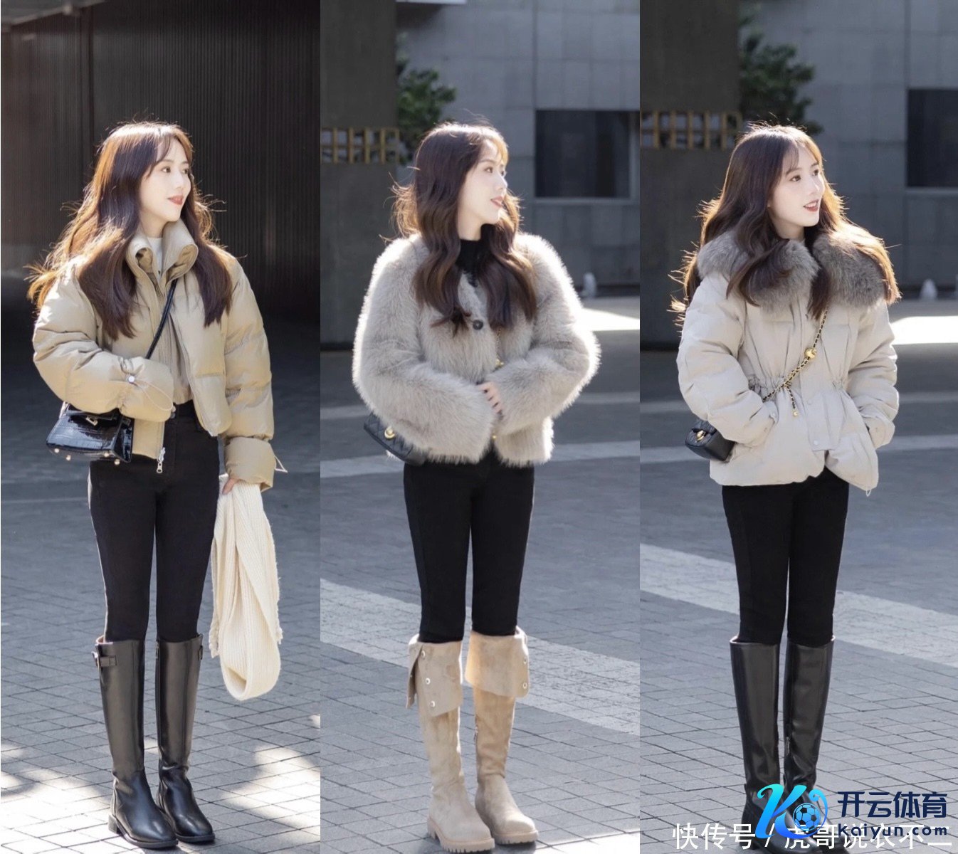 冬季外衣念念要御寒,羽绒服、棉服、皮草外衣都是首选,这类外衣天然御寒性好,然而无疑都有一个“缺陷”,那即是会显得肥壮,那么有了金莲裤与长筒靴的加捏,不错很好的改善这一“颓势”,从视觉上突显腿长,还能作念到显瘦显躯壳。