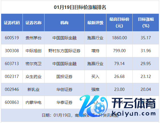 南财投研通数据清楚,1月19日,券商给以上市公司意见价共6次,按最新收盘价蓄意,意见价涨幅名次居前的公司有贵州茅台、中际旭创、密尔克卫,意见价涨幅远隔为35.17%、31.96%、29.95%,远隔属于白酒、通讯成立、物流行业。