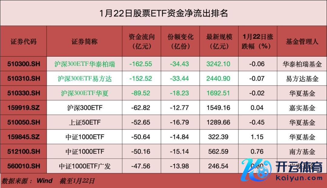 Wind数据透露,放弃1月22日,全阛阓1314只股票ETF(含跨境ETF)总规模达4.62万亿元。若按照区间成交均价测算,1月22日股票ETF举座净流出资金为633.12亿元,袭取“落地为安”。